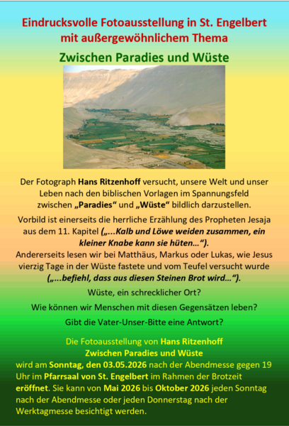 Die Ausstellung "Zwischen Paradies und Wüste" wird am Sonntag, den 03.05.2026 nach der Abendmesse gegen 19 Uhr im Pfarrsaal von St. Engelbert im Rahmen der Brotzeit eröffnet. Sie kann von Mai 2026 bis Oktober 2026 jeden Sonntag nach der Abendmesse oder jeden Donnerstag nach der Werktagmesse besichtigt werden.