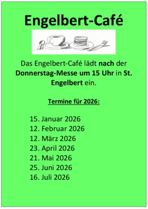 Einmal im Monat - in ca. 14tägigem Rhythmus mit der Brotzeit - laden wir zu einem gemütlichen Beisammensein nach der Donnerstagsmesse um 15 Uhr in den Engelberter Pfarrsaal bei Kaffee und Kuchen ein. Bei immer neuen Kuchenkreationen, natürlich selbst gebacken, bietet sich die Möglichkeit zu einem lockeren Gedankenaustausch, zum Kennenlernen neuer Menschen oder zum Wiedersehen alter Bekannter. Jeder ist herzlich willkommen. Wer mag, darf am Ende unser Schweinchen "füttern", dessen Erlös an eine caritative Einrichtung in Remscheid geht. Das Kaffee-und-Kuchen-Team würde sich sehr freuen, auch Sie beim nächsten Mal begrüßen zu dürfen!