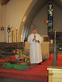 Heute haben wir in der Kirche das Erntedank-Fest gefeiert. Dafür haben die Eltern Obst und Gemüse gespendet, womit wir den Altar geschmückt haben. Die Kinder haben zusammen mit den Erzieherinnen etwas zum Thema "Ernte" vorgeführt und Christopher hat uns musikalisch begleitet.