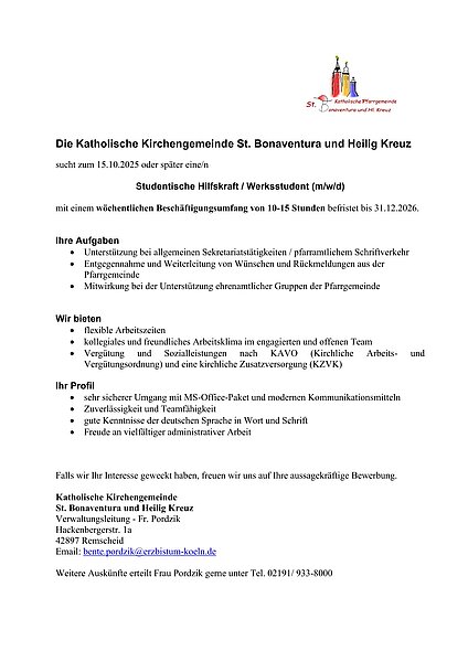 Stellenausschreibung Studentische Hilfskraft Pfarrbüro St. Bonaventura: